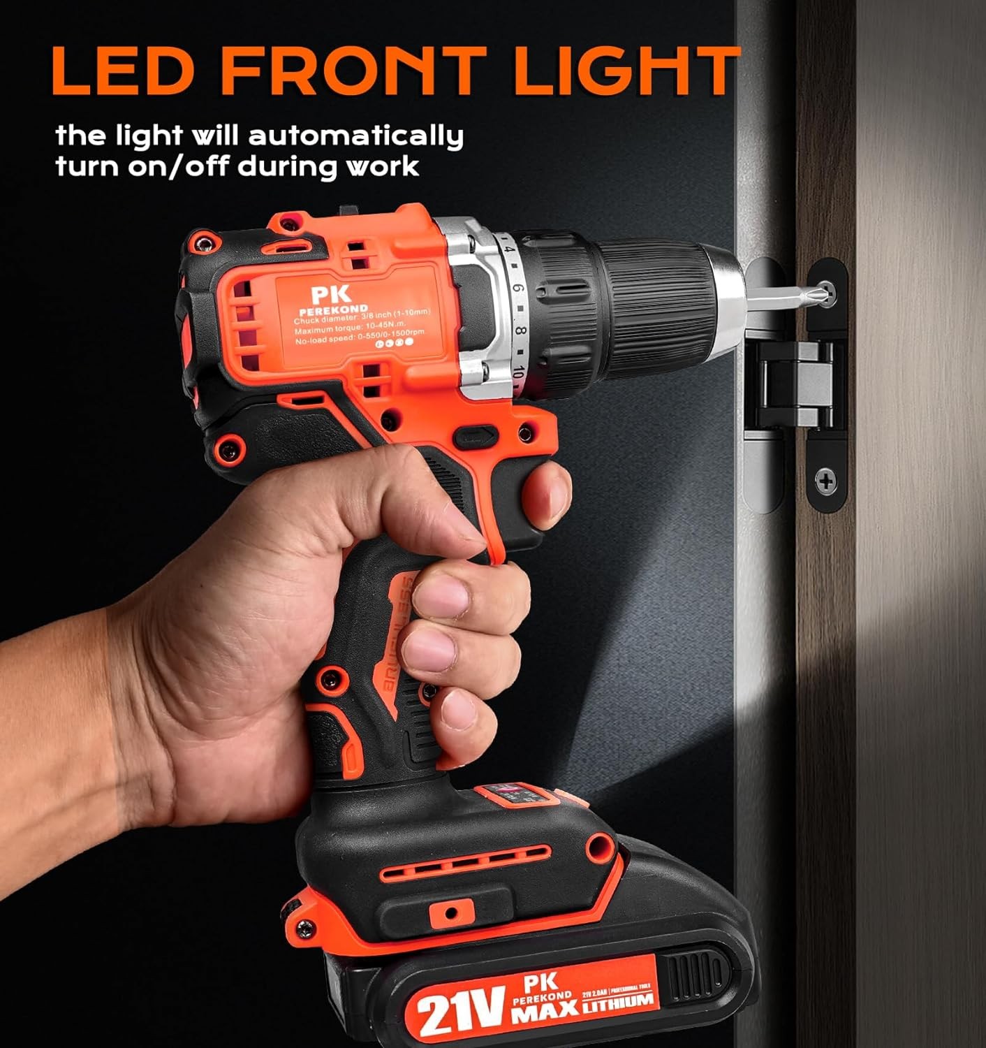• ? [New Version 2.0 Brushless Motor] Powered by PKperekond improved brushless motor, this 60Nm drill significantly reduces noise and ensures a longer battery life. It performs perfectly in drilling wood and metal, replacing screws, turning nuts and stripping wires, while reducing the risk of motor overheating. The model adopts 2023 upgraded appearance, with a compact structure it can provide utmost safety for everyday use.
