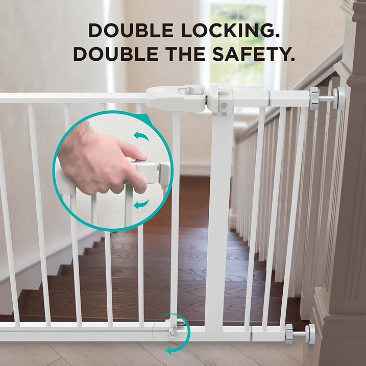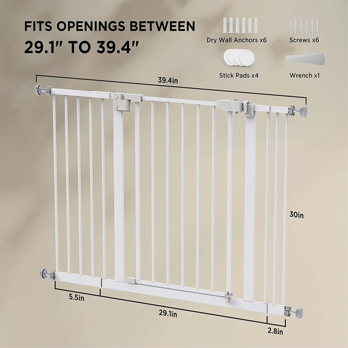30" Height Baby Gate 29.1" to 39.4" Extra Wide Dog Gate with 2.8/5.5/8.3 inch Extension Kit for Stairs, Hallways, Bedrooms, White