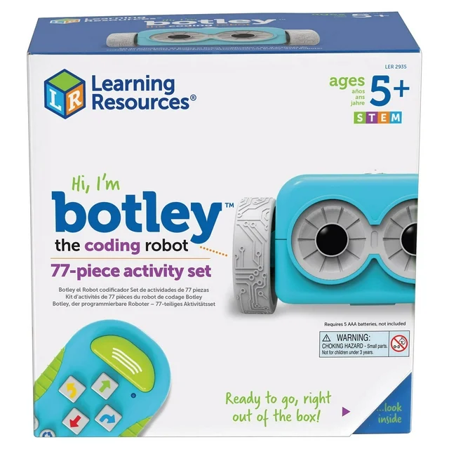 Meet Botley, the code to fun! As the newest member of the Learning Resources family, Botley is here to introduce coding in an easy, friendly way. Children as young as 5 can learn to code with Botley, and with his advanced features, he'll grow with them for many play filled years to come. Botley is ready to use right out of the box he'll have kids coding in minutes. And that's not all, Botley is 100% screen free and includes a 77-piece activity set the only robot to offer that! Botley also has additional hidden features to unlock! Here are just some of the interactive, fun features Botley offers: Your child will get to learn early STEM skills while playing and having fun. Botley teaches the basics of coding through active play, completely screen free. Perfect for promoting critical thinking and problem solving skills. Completely screen free coding no phone or tablet required. Botley has an easy-to-use remote programmer, which transmits your commands and off he'll go! Botley can detect objects and be programmed to go around objects with if/then logic. He can also follow looping commands, take on obstacle courses, follow black lines and has hidden features to unlock! Botley's 77-piece activity set comes with a remote programmer, detachable robot arms, 40 coding cards, 6 double-sided tiles, 27 obstacle building pieces and a starter guide with coding challenges