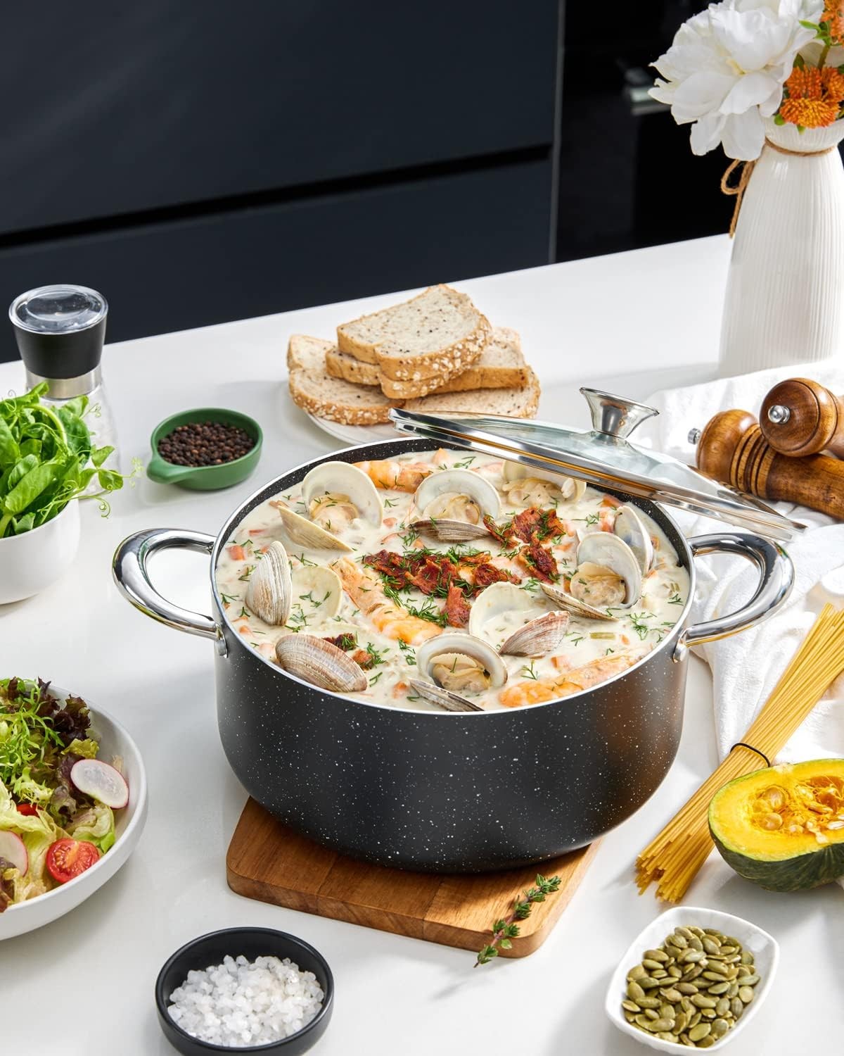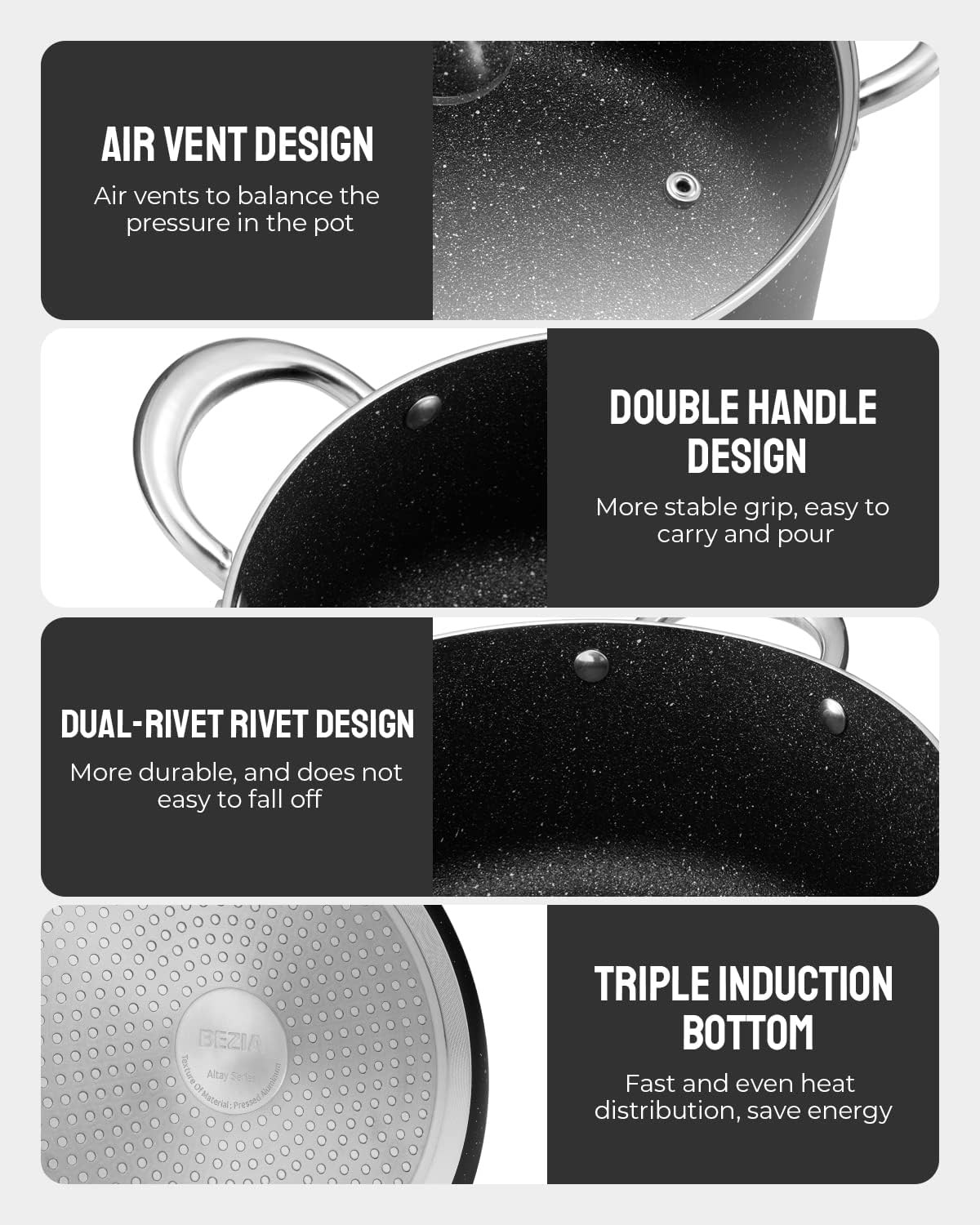 • ROUGH GRANITE NONSTICK COATING - The main reason people use excessive amounts of oil or fat in cooking is to prevent the food from sticking to the vessel and burning. Our BEZIA pot features a rough granite nonstick coating, which ensures foods and sticky sauces don’t stick to your pot while using, thereby, stirring curries and dry food in a nonstick cooking pot is easier. When you use BEZIA non-stick soup pot, you don’t need to spend time and effort scraping food off the walls of the vessels!