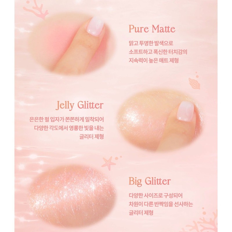 A summer coral palette that shines brilliantly with the addition of crushed mother-of-pearl glitter under the coral-colored sunlight.