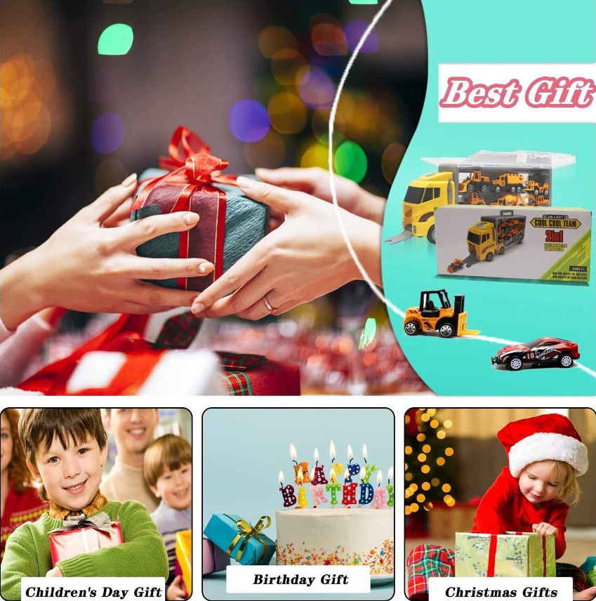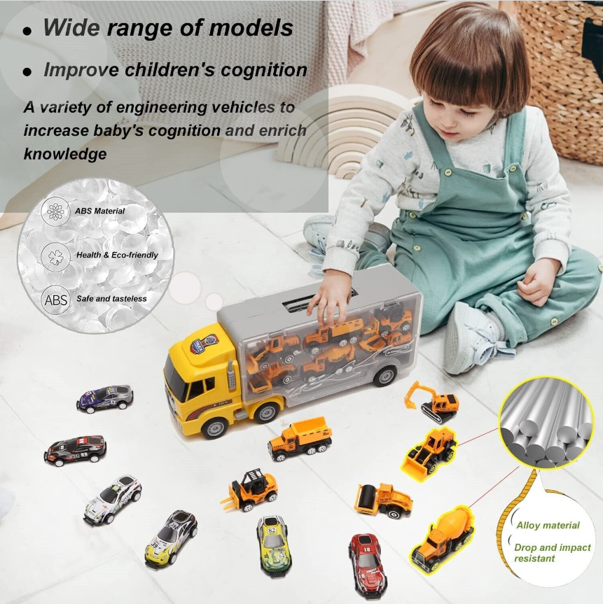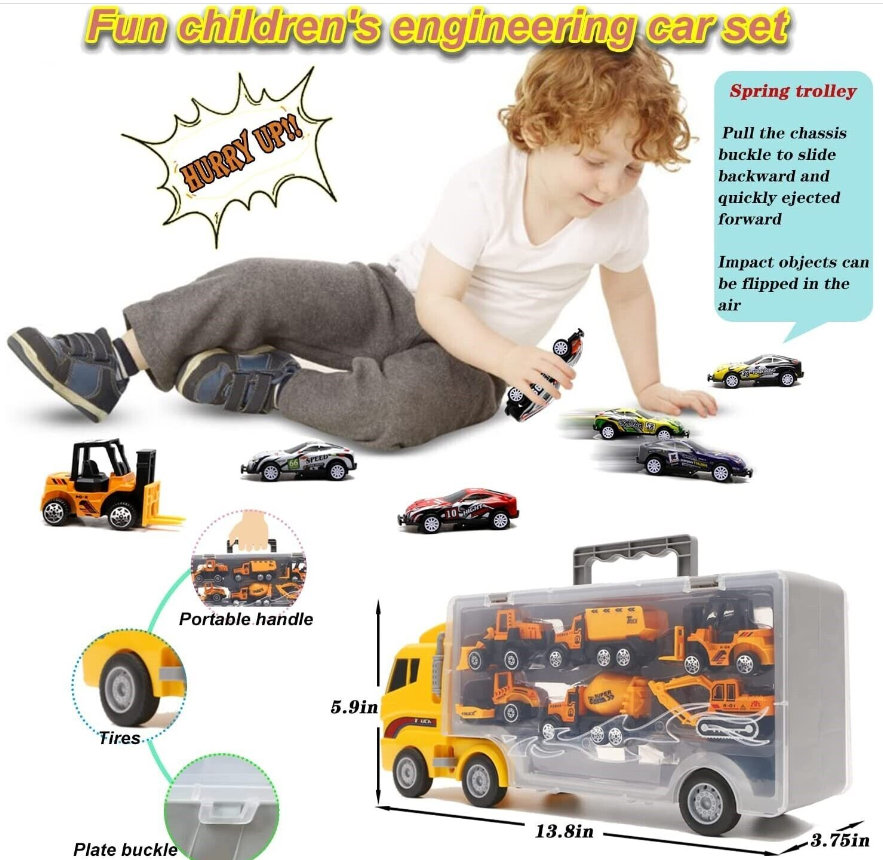 This 13-in-1 truck toy set serves as a birthday/party/Christmas gifts for children, so your child can receive both a large transport truck and 6 small construction/fire trucks and 6 small racing cars.