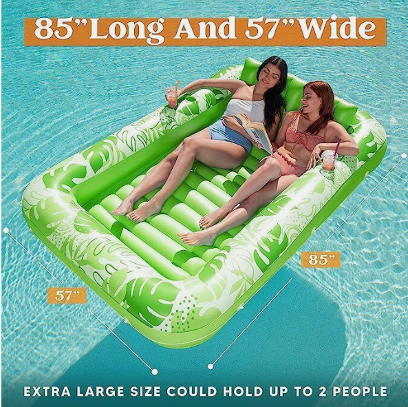 • INCLUDES. Packaged includes one 85” x 57” extra large inflatable suntan pool float featured with Inflatable base for extra comfort, two 3”drink holders, one removable headrest, wrap around rope