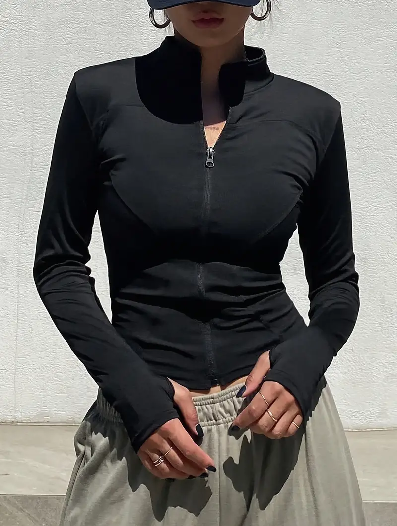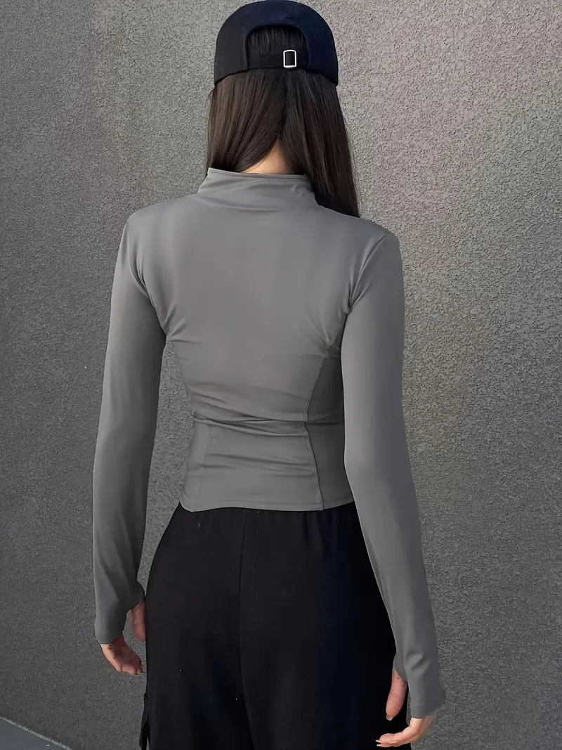 Solid Zipper Front Slim Top, Versatile Long Sleeve Mock Neck Top For Spring & Fall, Women's Clothing