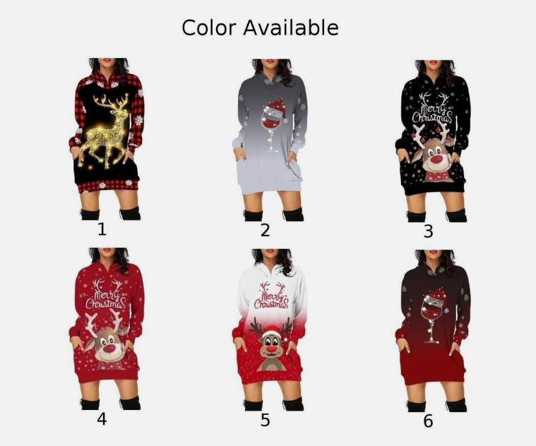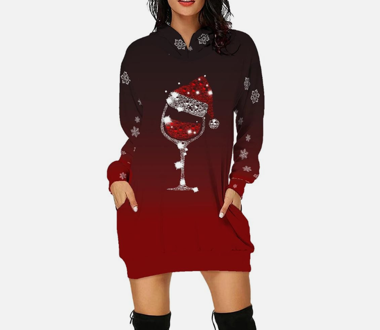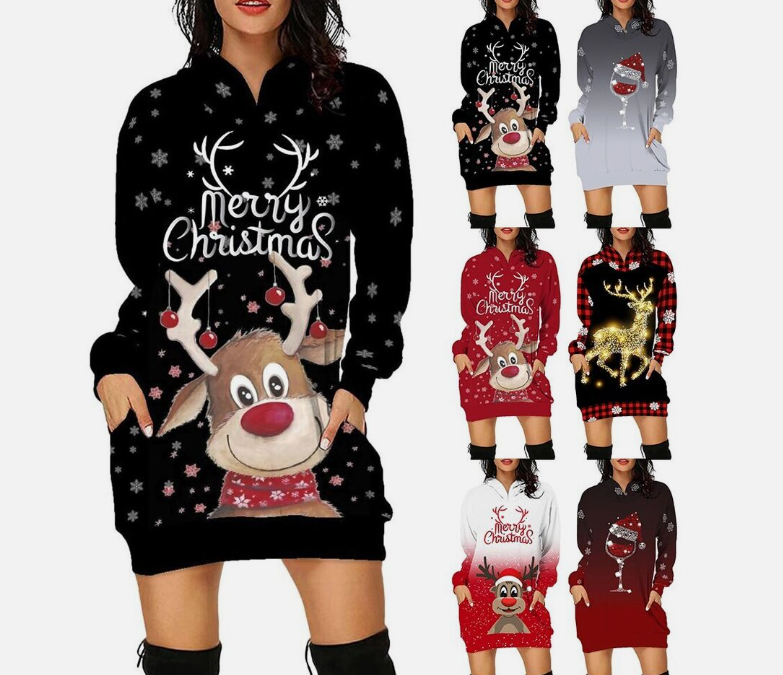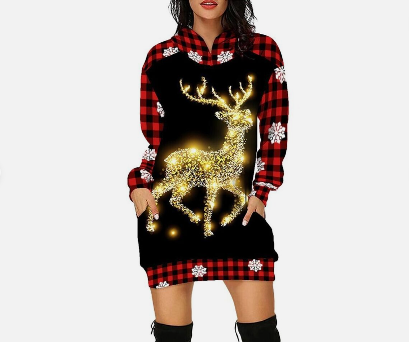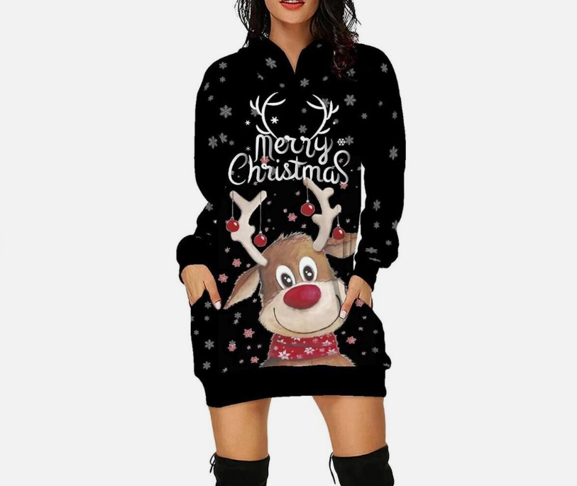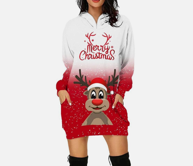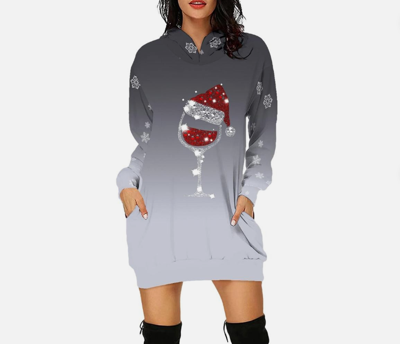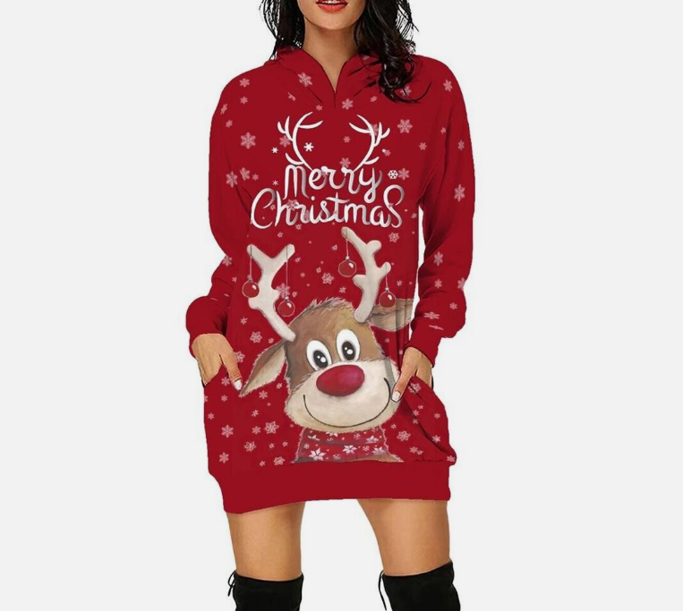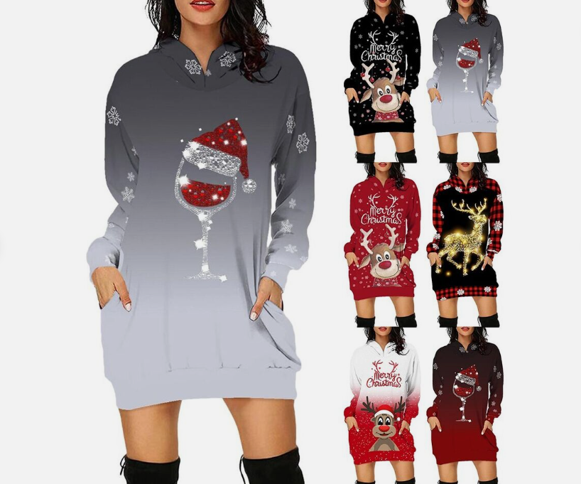 Stylish Elegant Christmas Print Hooded Skirt Longsleeved Sweatshirt Dress