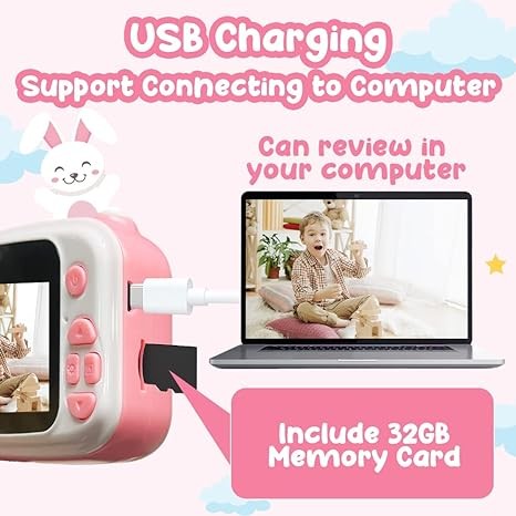 • ?【Built-in Rechargeable Battery & 32G SD card】Built-in large capacity lithium battery can continuously taking photos for 2-3 hours after full charged. Kids digital camera with large 32GB SD card which can store 5,000 pictures.